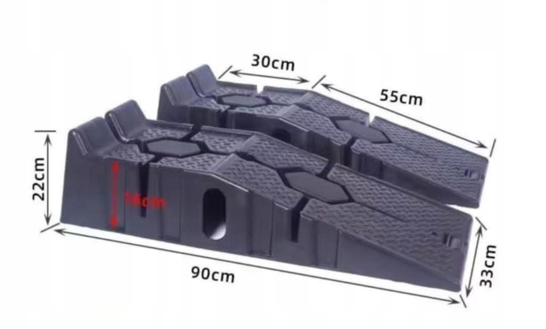 • ➡️ Solidna konstrukcja – Rampy wytrzymują obciążenie do 3 ton, zapewniając stabilność i bezpieczeństwo podczas użytkowania. Trwały materiał odporny jest na pęknięcia i odkształcenia.